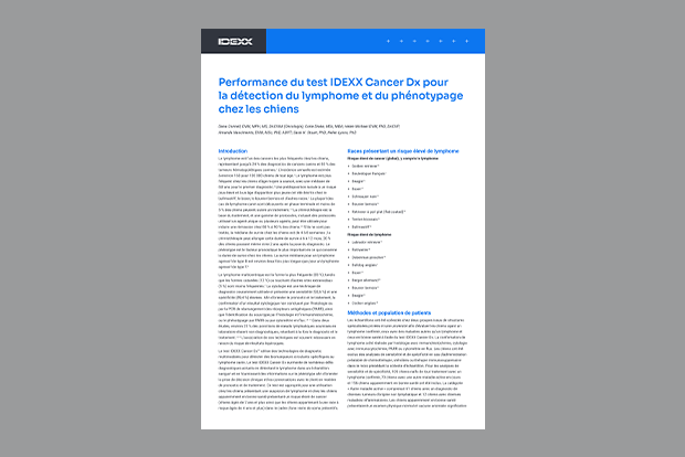 Le test IDEXX Cancer Dx permet une détection précise de biomarqueurs spécifiques au lymphome canin dans le sérum et le sang total. Le phénotypage B versus T est fourni en cas de résultat positif, lorsqu’il est disponible, sans coût supplémentaire.